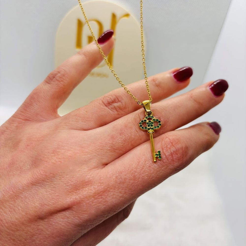 Add a touch of magic and vintage charm to your jewelry collection with this beautiful green zircon key necklace.