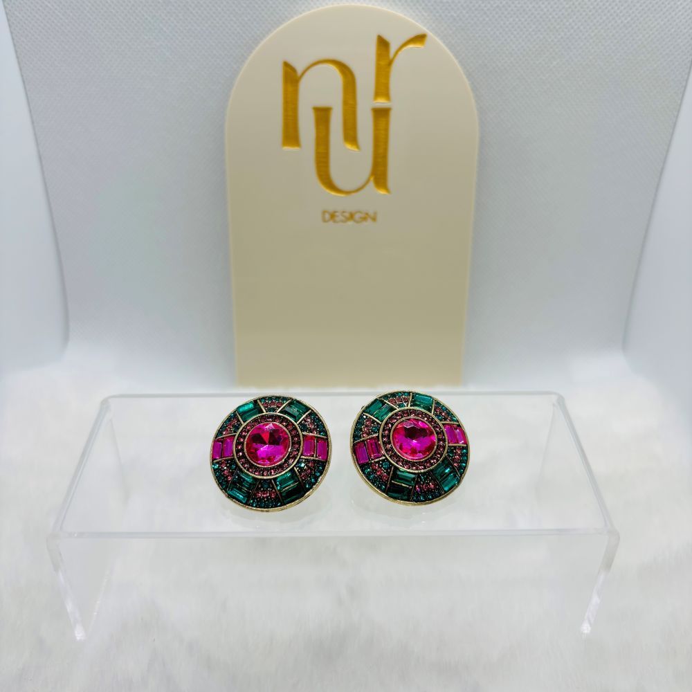 Add a pop of color and elegance to your look with these modern geometric stud earrings. Designed with a striking circular motif, each earring features a vibrant mix of emerald-green and pink accents arranged in a bold striped pattern.