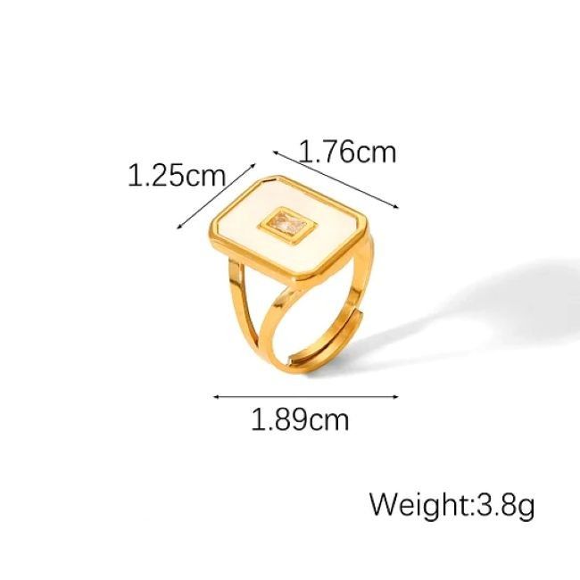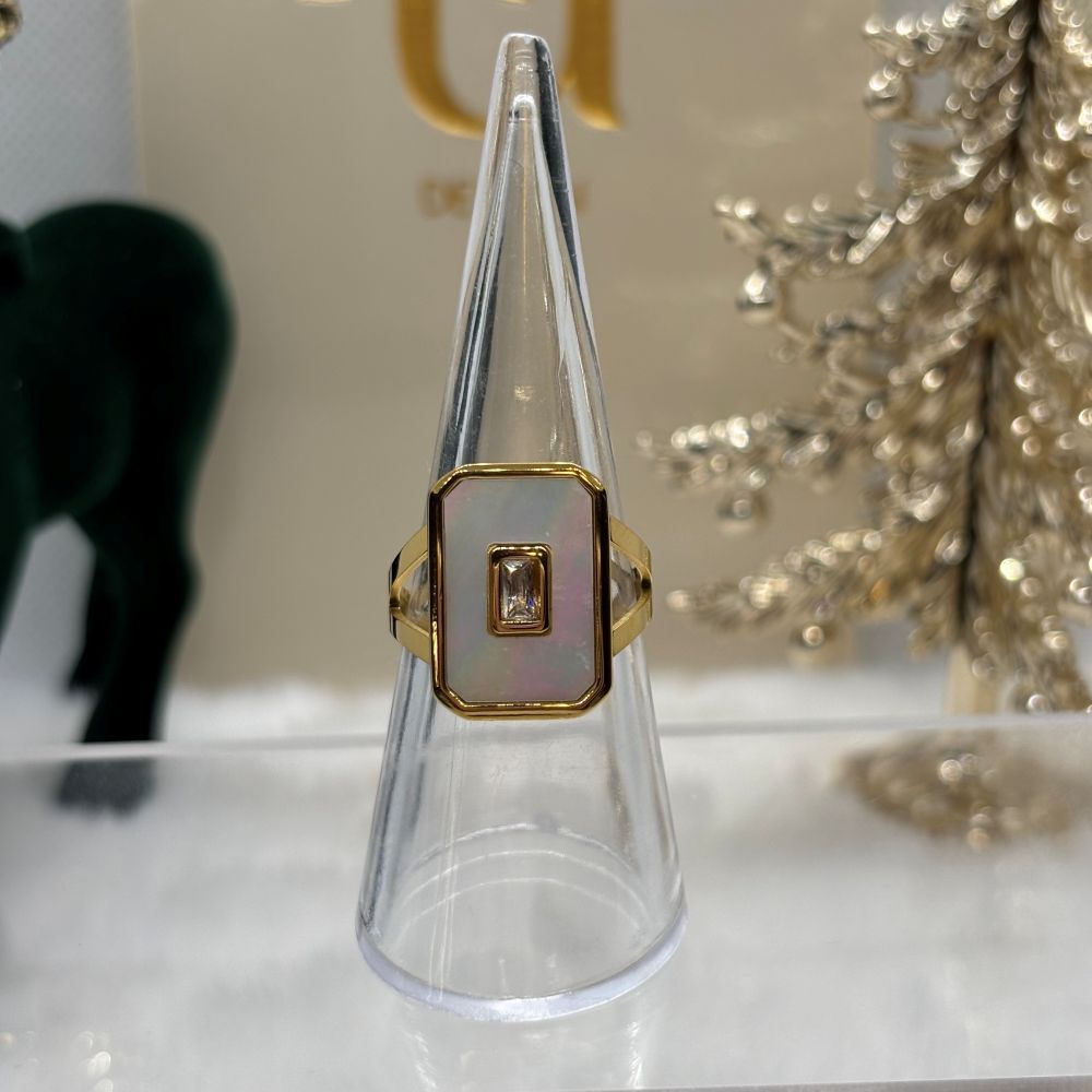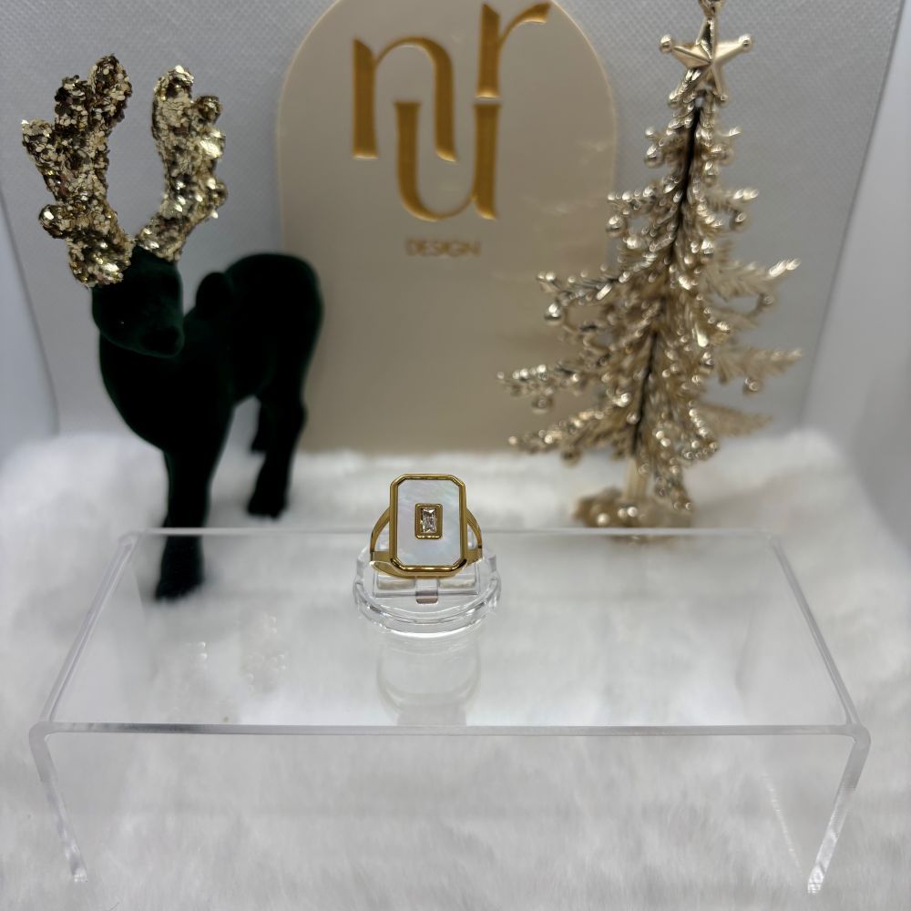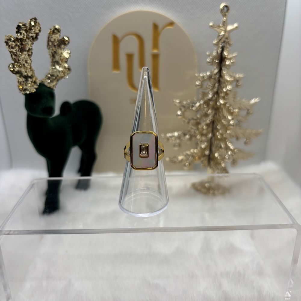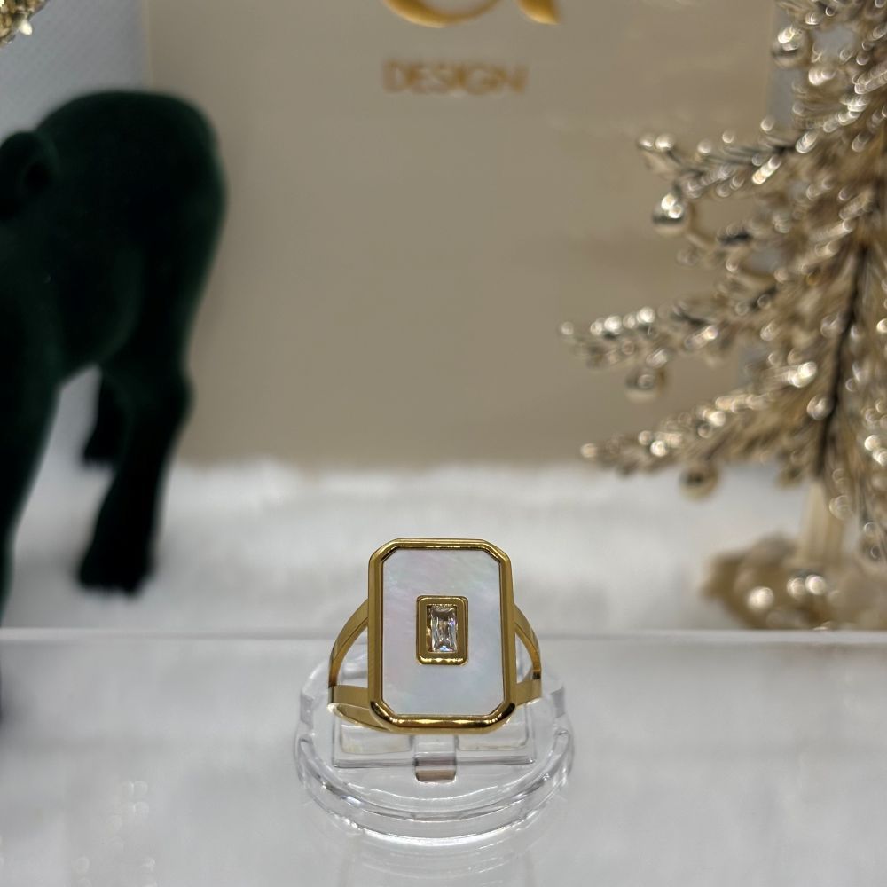 The ring features a sleek rectangular geometric face with a glossy, mother-of-pearl–style inlay and a sparkling center stone—perfect for those who love clean lines, minimalist glamour, and Instagram-worthy accessories.